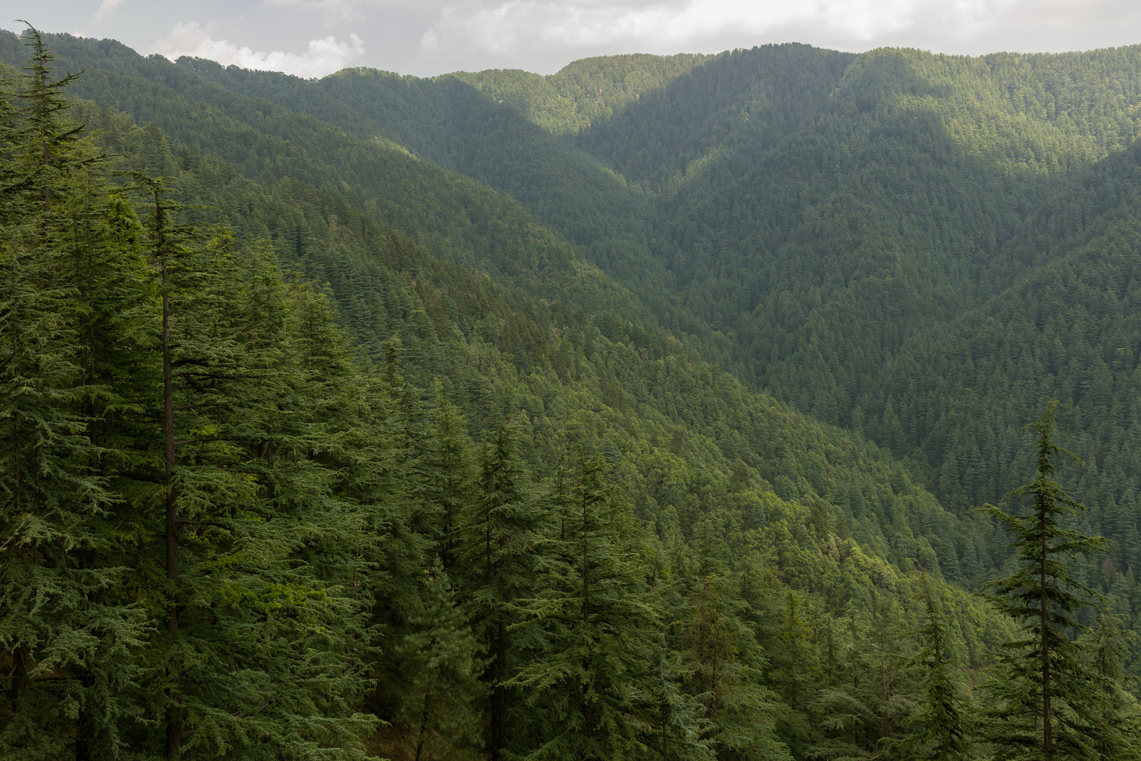 A long view across a typical low-land farming community. Rice paddies are irrigated by small channels that divert the central stream flow.